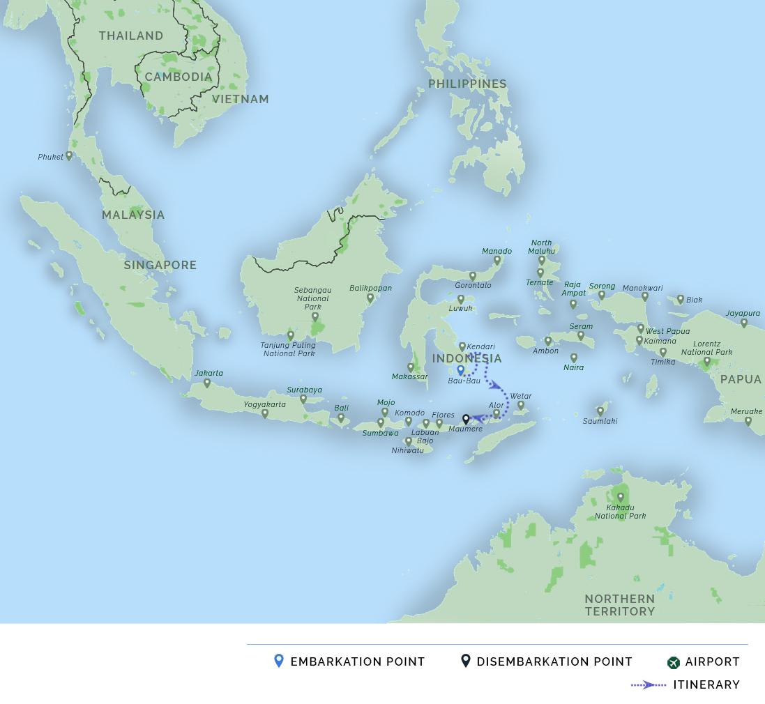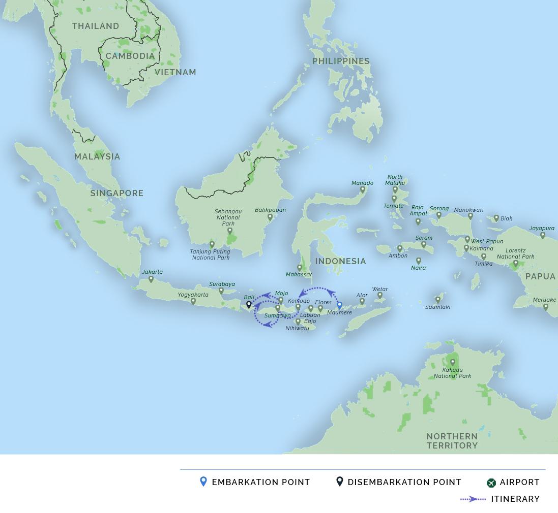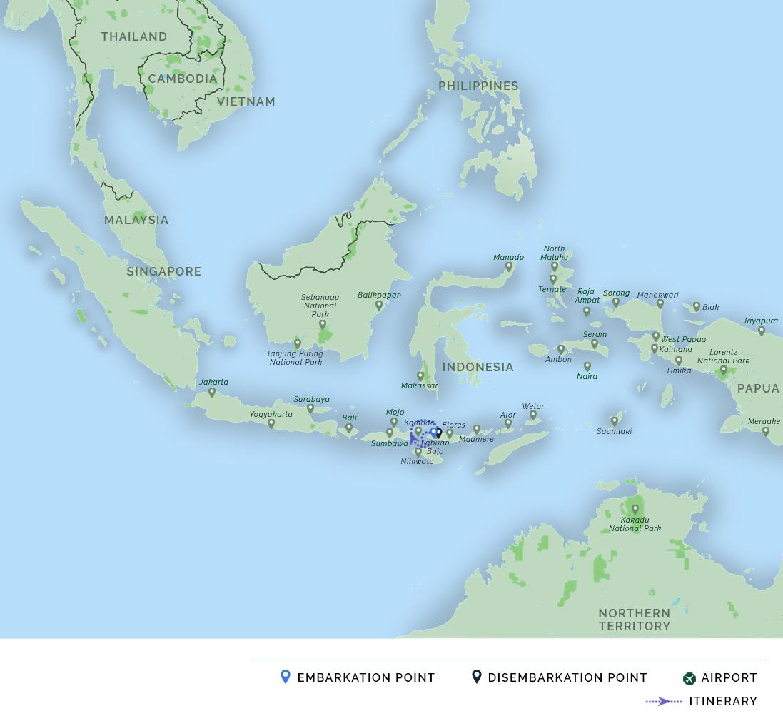 AM: A domestic flight from the island of Bali or Jakarta brings you to the harbor town of Labuan Bajo on the island of Flores. Our staff greets you at the airport and facilitates your transfer to your hotel (on day before departure) or to the harbor where Adelaar is anchored (on the day of departure).
